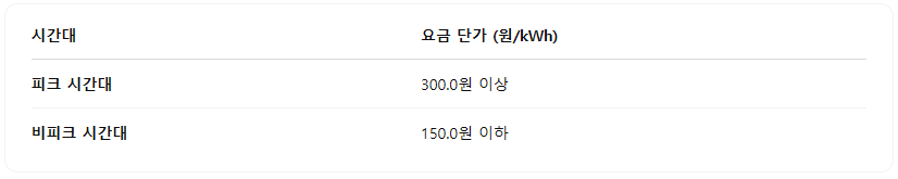 이 제도는 사용자가 전력을 효율적으로 사용할 수 있도록 유도하며, 특히 피크 시간대(오후 2시5시)에는 높은 요금이 부과되고, 비피크 시간대(밤 10시다음 날 오전 8시)에는 상대적으로 저렴한 요금이 적용됩니다.