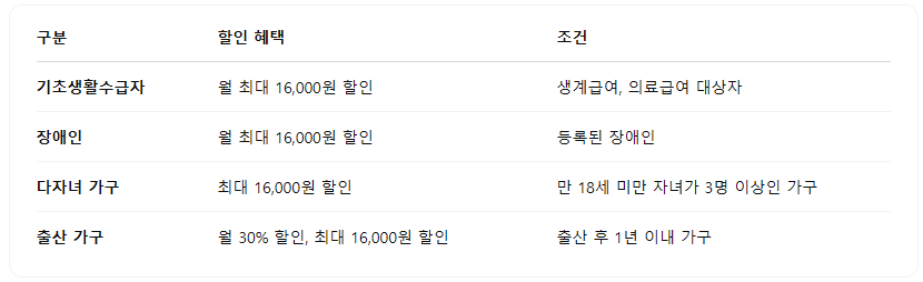 월 최대 16,000원 할인 생계급여, 의료급여 대상자