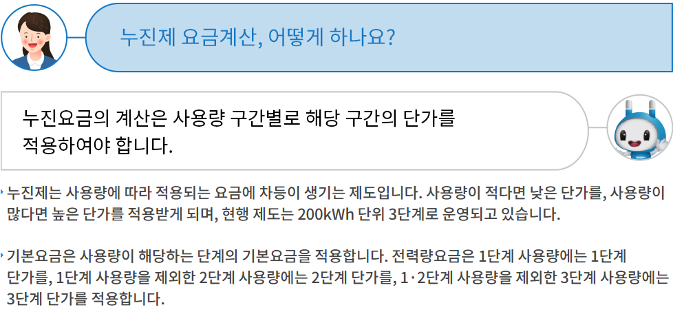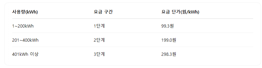 1단계(1200kWh)는 가장 저렴한 요금이 적용되며, 2단계(201400kWh)와 3단계(401kWh 이상)로 갈수록 요금이 급격히 상승합니다.
