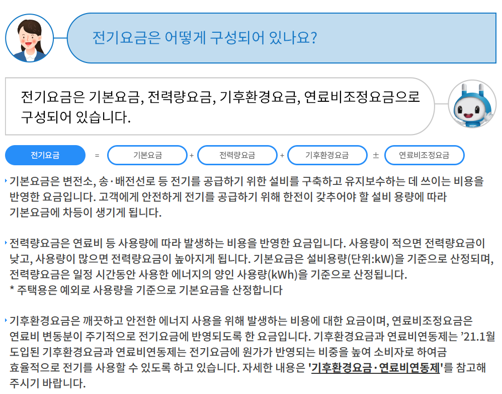 기본적인 전기요금은 크게 기본요금과 전력량 요금으로 나누어지며, 각각의 요금은 사용량과 전력 소비 패턴에 따라 차등 적용됩니다.