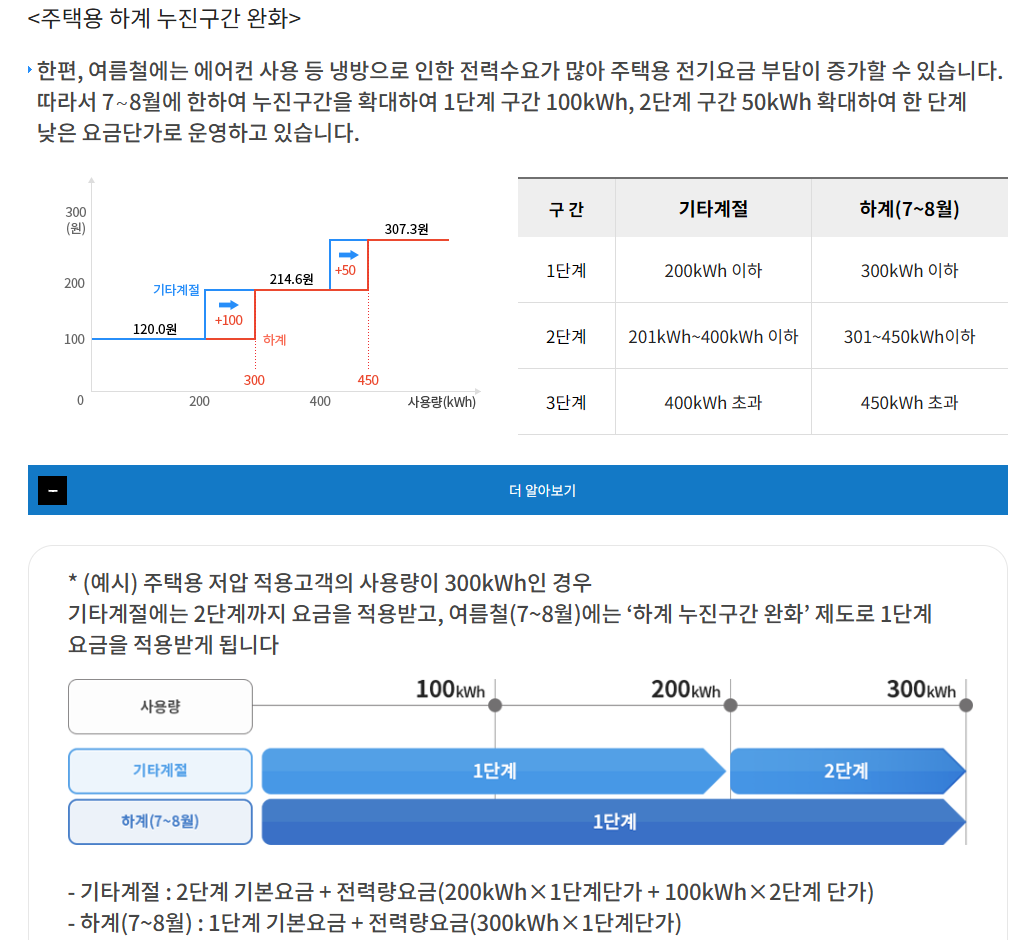 여름철(7~8월) 동안, 전기 사용량이 많은 가구에 대해 누진세 1단계 구간이 200kWh에서 300kWh로 확장됩니다.