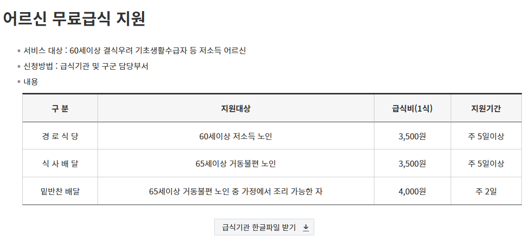 다만, 일부 노인복지관에서는 65세 이상 전체를 대상으로 선착순 급식을 운영하는 경우도 있습니다.