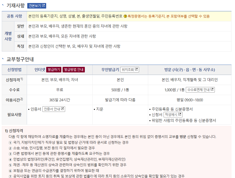 ※ 보통 공공기관에서는 ‘일반’으로 충분하지만, 금융기관이나 법원 제출용은 ‘상세’ 이상을 요구하는 경우가 많습니다.