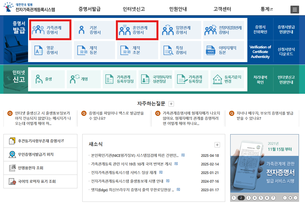 정부 24 외에도 전자가족관계등록시스템을 통해서도 혼인·가족관계 증명서 발급이 가능합니다.