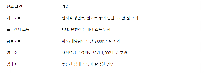 📍일시적인 강의료, 원고료 등 기타소득이 연간 300만 원을 초과했다면? ➡️ 이 역시 신고 대상입니다.