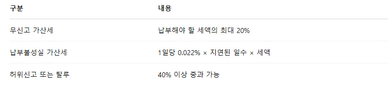 신고를 누락하거나 납부를 지연하면 가산세가 부과됩니다.