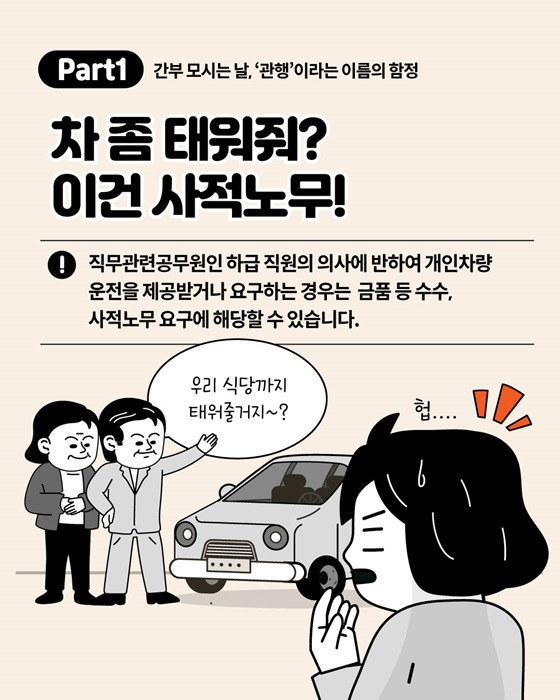 상급자가 하급자에게 개인 차량을 제공받거나 운전을 요구하는 것은 엄연히 사적 노무 요구에 해당할 수 있습니다.
