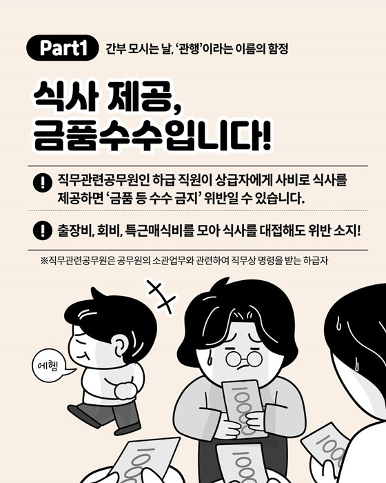 단순히 예의를 차린다는 명목으로 식사를 대접하는 경우에도 금품 수수로 간주될 수 있으며, 출장비나 회비, 특근매식비를 모아 대접하는 것도 법적 문제가 될 수 있습니다.