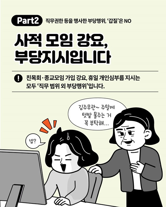 직무와 관련 없는 금품 수수, 사적 노무 요구, 부당한 지시 등은 결코 허용될 수 없는 행위입니다.