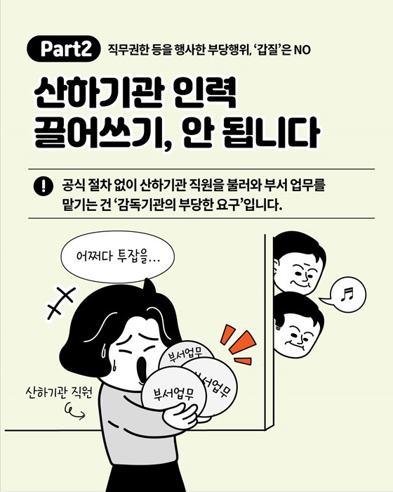 산하기관 인력을 공식적인 절차 없이 본인의 부서로 불러 업무를 맡기는 행위 역시 부당한 권한 남용에 해당합니다.