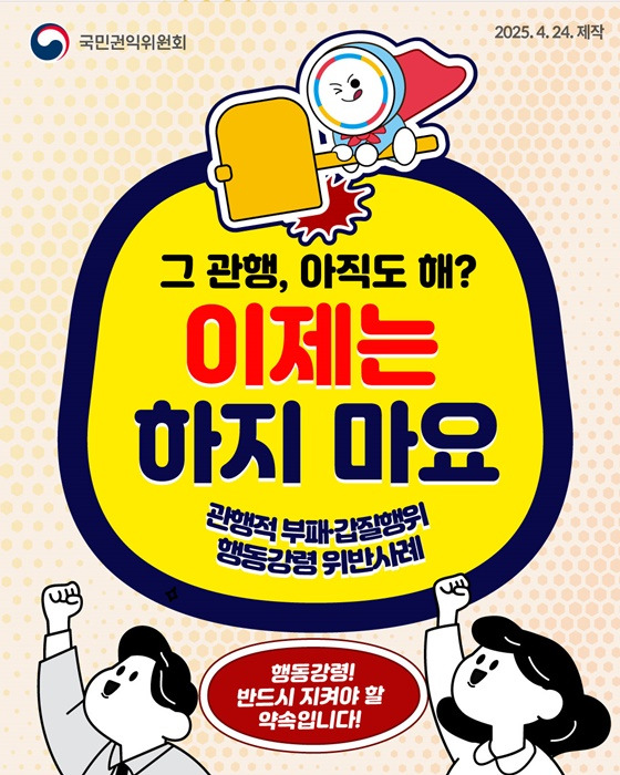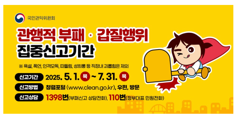 국민권익위원회가 공공기관 근무현장에서 발생할 수 있는 관행적 부패행위와 직무상 갑질을 예방하고 근절하기 위해 5월 1일부터 7월 31일까지 ‘행동강령 위반행위 집중 신고기간’을 운영한