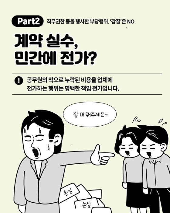 공무원이 실수로 발생한 비용이나 계약 누락을 민간 업체나 하급자에게 전가하는 것은 명백히 부당한 행위입니다.